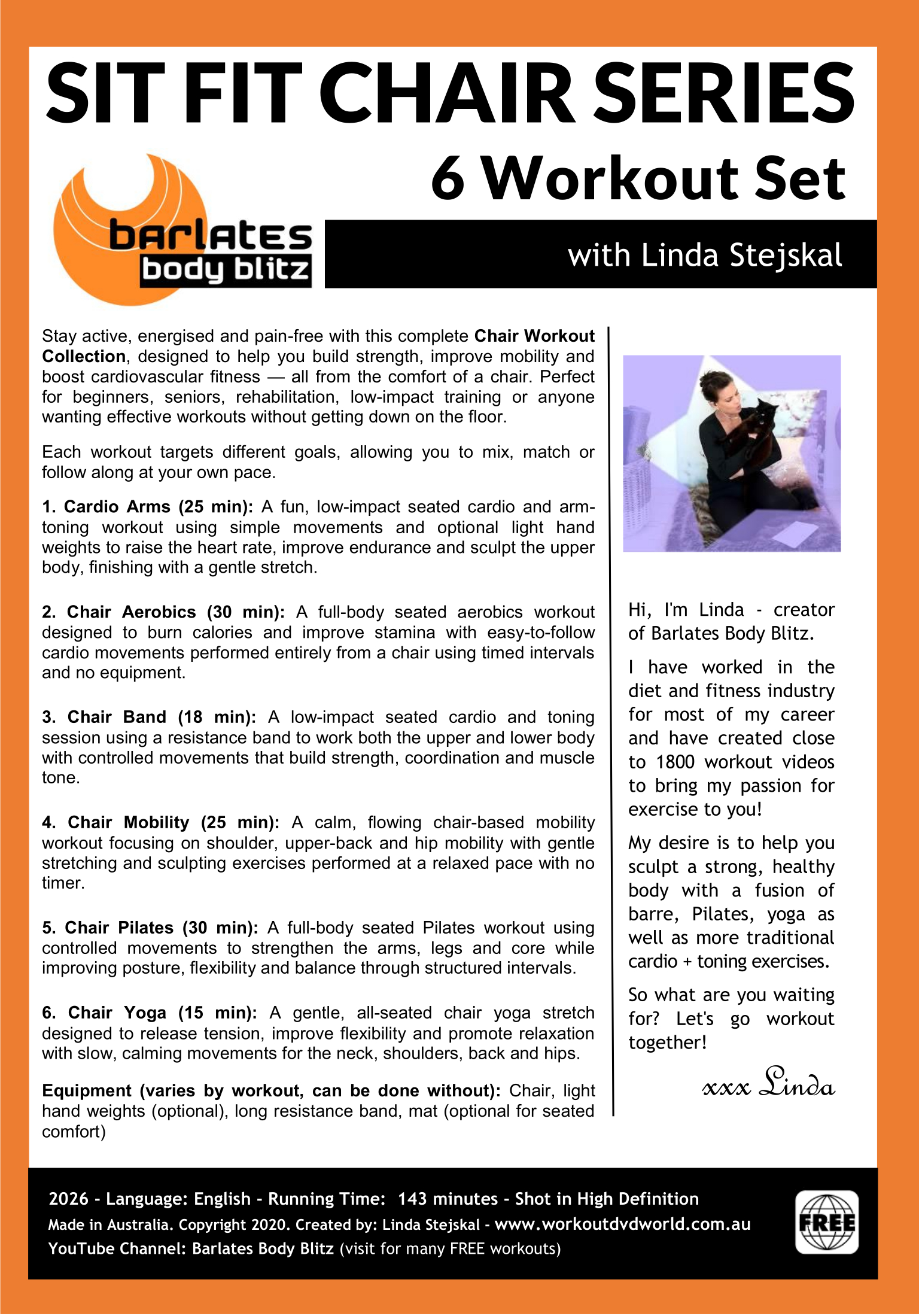 All workouts are performed seated on a chair, making this collection joint-friendly, easy to follow and ideal for home fitness.