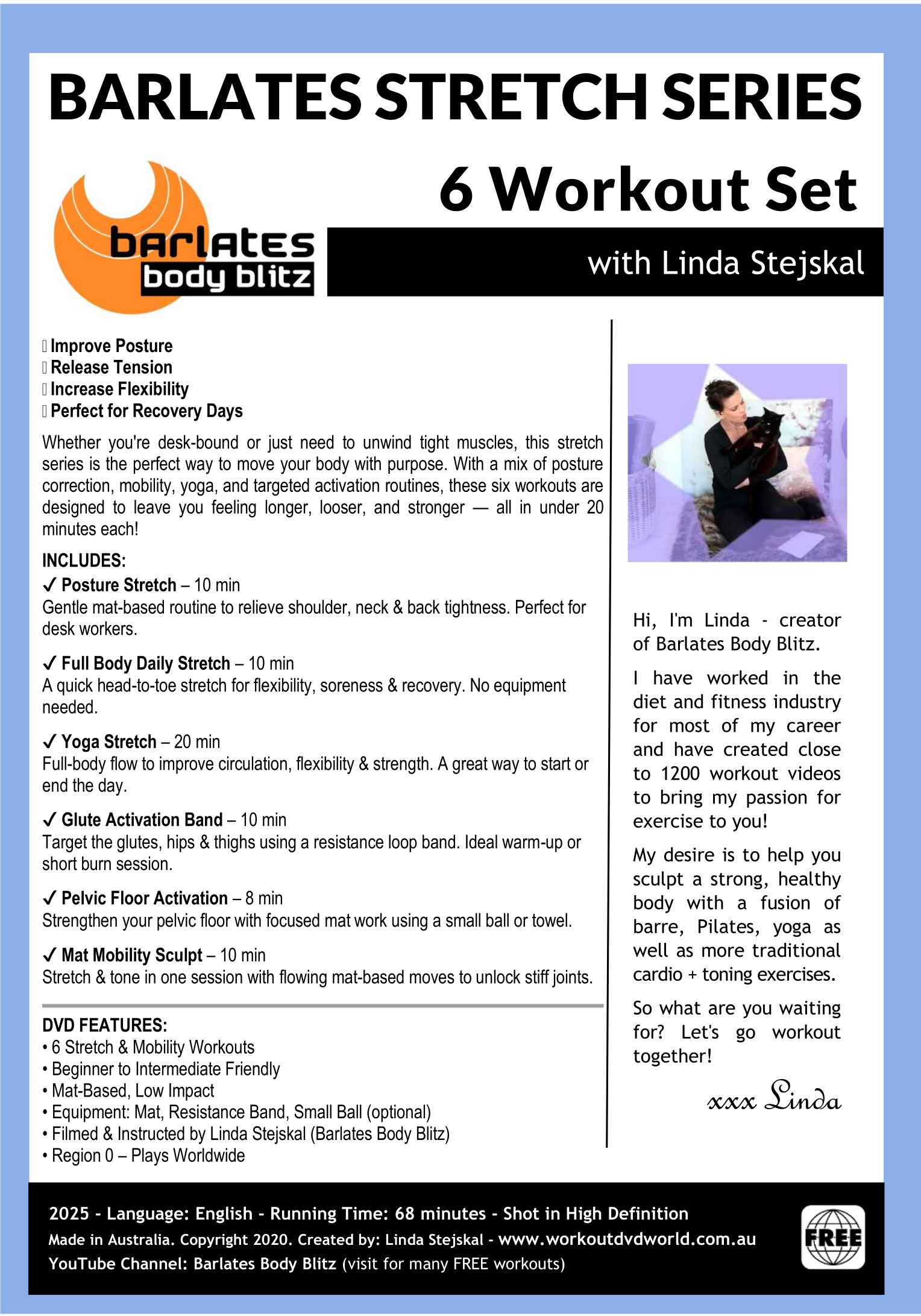 Discover the ultimate Stretch & Mobility Series by Linda Stejskal (Barlates)! This DVD and download set features 6 beginner to intermediate-friendly workouts, each under 20 minutes, designed to improve posture, release tension, and increase flexibility.