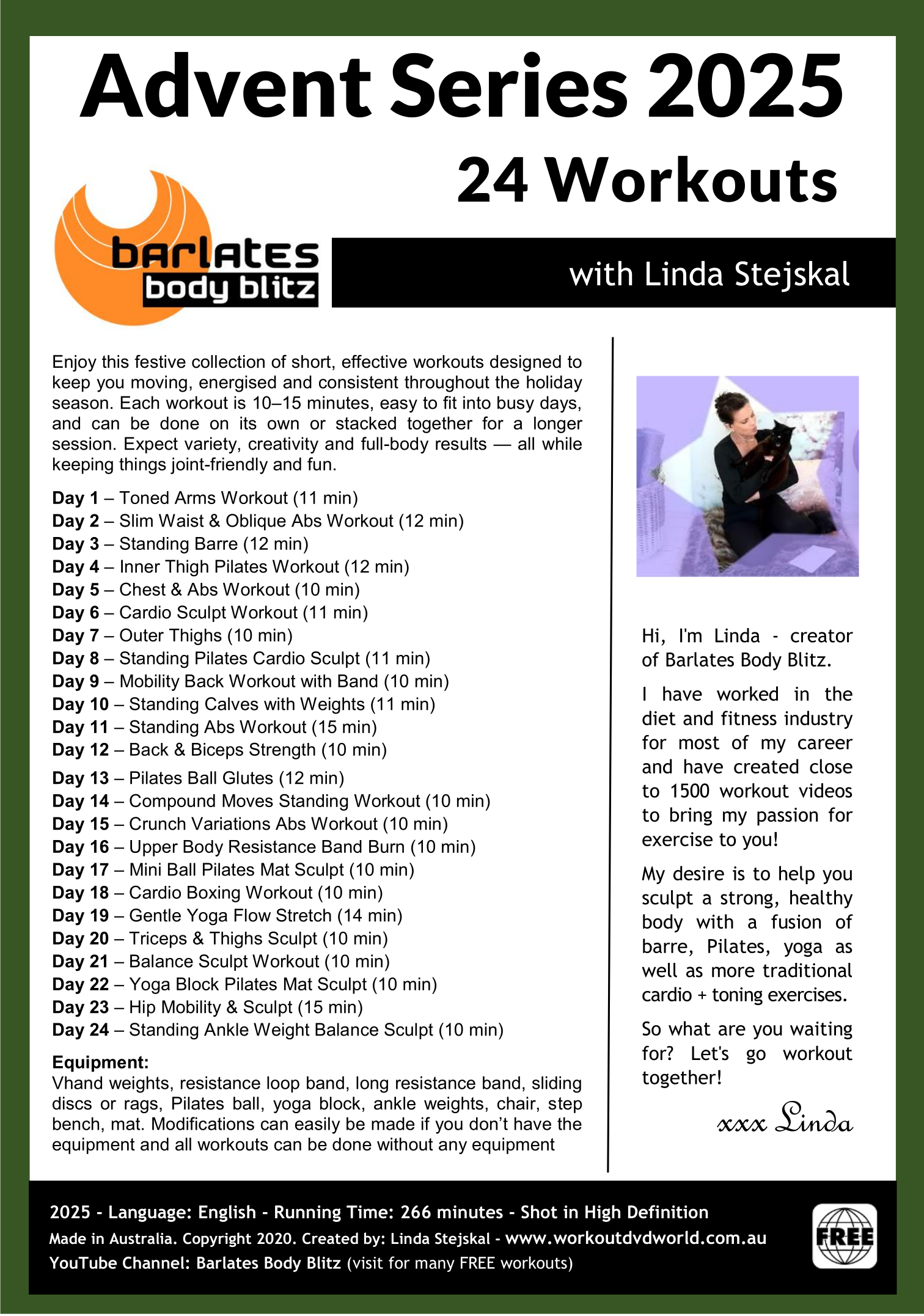 Stay consistent, energised and motivated with this complete Advent Workout Snack Series DVD collection — featuring 24 short Pilates, cardio and sculpt workouts designed to be mixed, matched or stacked to suit your schedule.