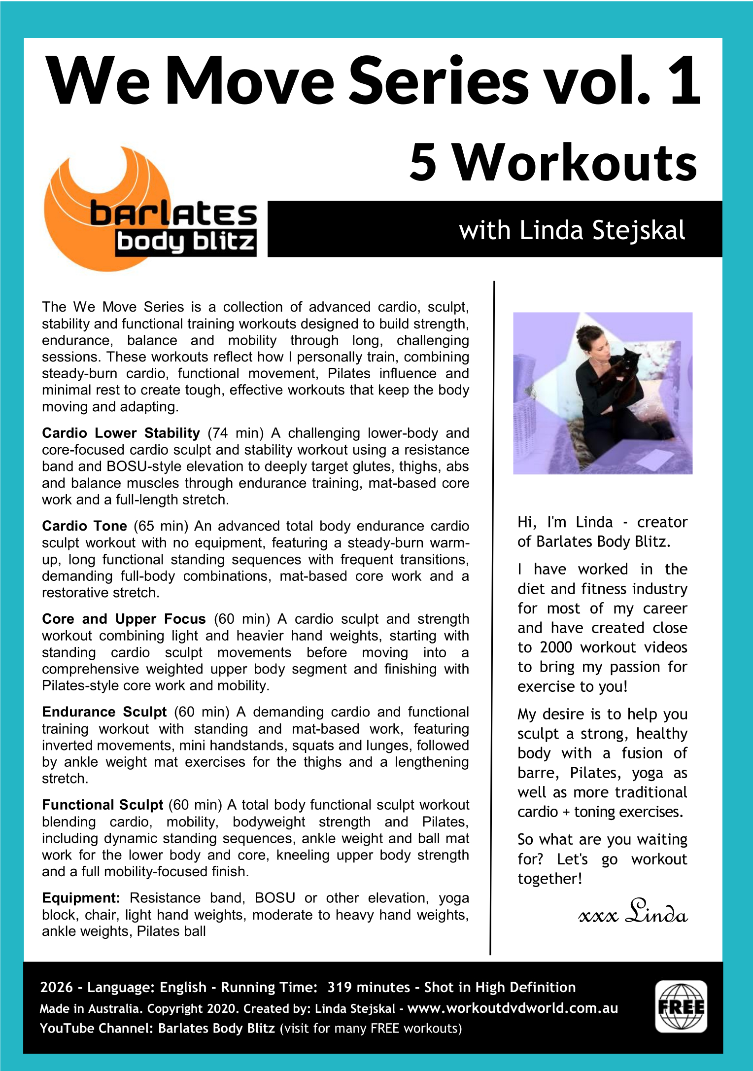 The We Move Series is an advanced workout DVD collection featuring long, challenging cardio sculpt, stability and functional training workouts. Designed for experienced exercisers, this series focuses on building strength, endurance, balance and mobility through steady-burn, no-nonsense training.