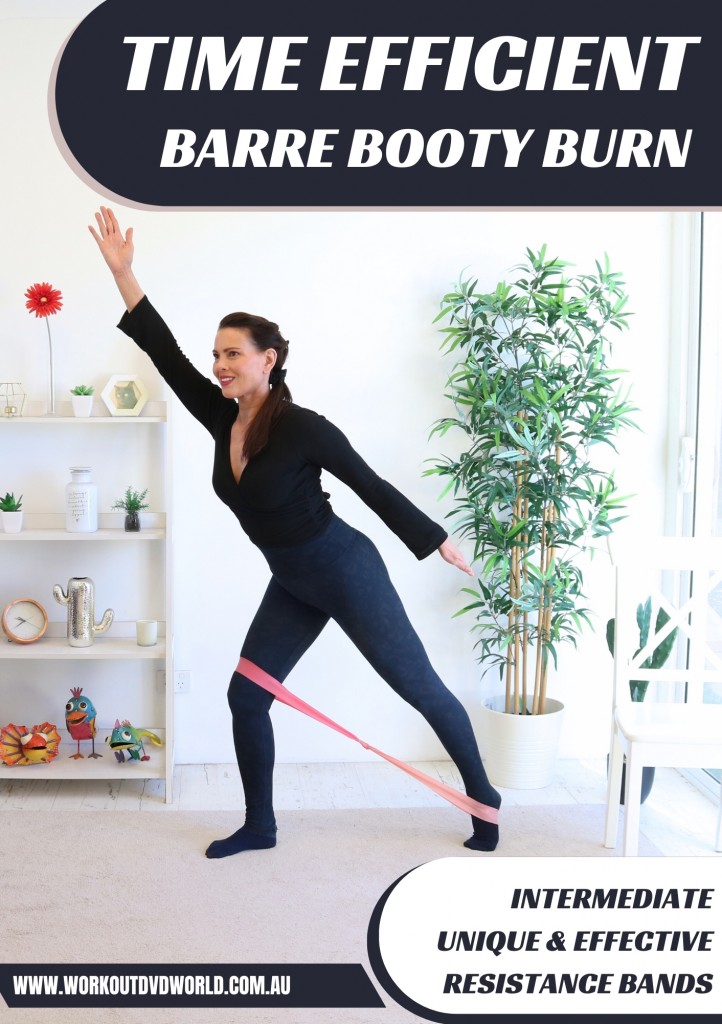 This 25-minute Barre Booty Burner Workout uses a resistance loop and a chair to target your glutes, legs, and arms. We’ll start with a short cardio barre warm up, then move into a light weights arms segment in wide plié and lunge positions to engage the lower body.